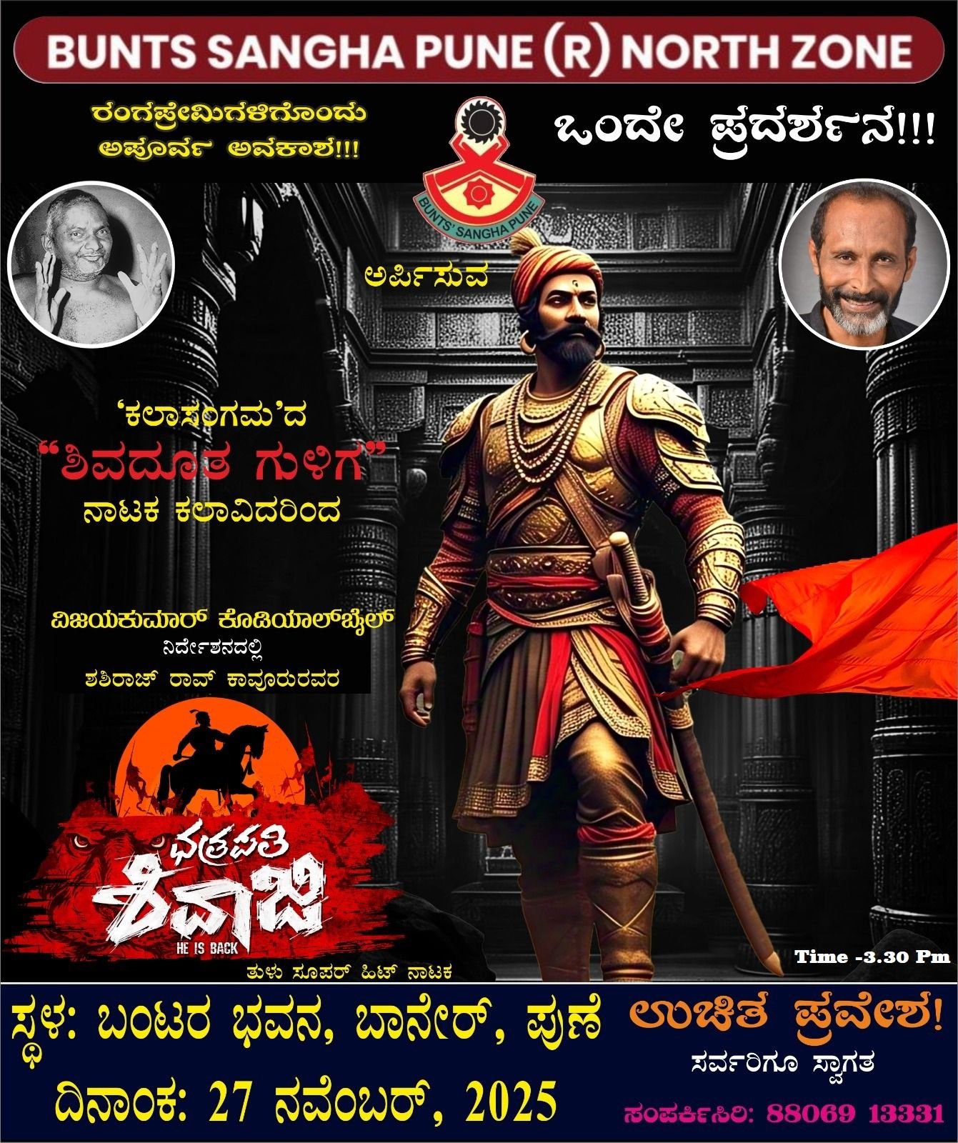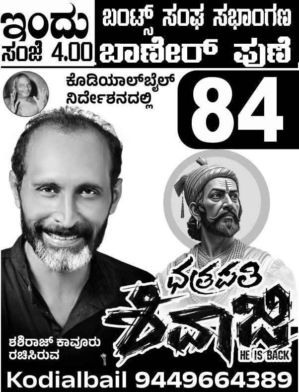 ವಿಜಯಕುಮಾರ್ ಕೊಡಿಯಾಲ್ ಬೈಲ್ ರವರ ನಿರ್ದೇಶನದ ‘ಕಲಾಸಂಗಮ’ದ ‘ಶಿವದೂತ ಗುಳಿಗ’ ಕಲಾವಿದರಿಂದ ಮೂಡಿಬರುವ ‘ಛತ್ರಪತಿ ಶಿವಾಜಿ’ ನಾಟಕದ ಒಂದೇ ಒಂದು ಪ್ರದರ್ಶನವು ಇದೇ ಬರುವ 27 ನೇ ಗುರುವಾರ ಮಧ್ಯಾಹ್ನ 3.30 ಕ್ಕೆ “ಬಂಟರ ಭವನ, ಬಾಣೇರ್” ನಲ್ಲಿ ನಮ್ಮ ಎಲ್ಲಾ ಕಲಾಭಿಮಾನಿಗಳಿಗೆ ಉಚಿತವಾಗಿ ನೋಡುವ ಸುವರ್ಣಾವಕಾಶವಿದೆ .